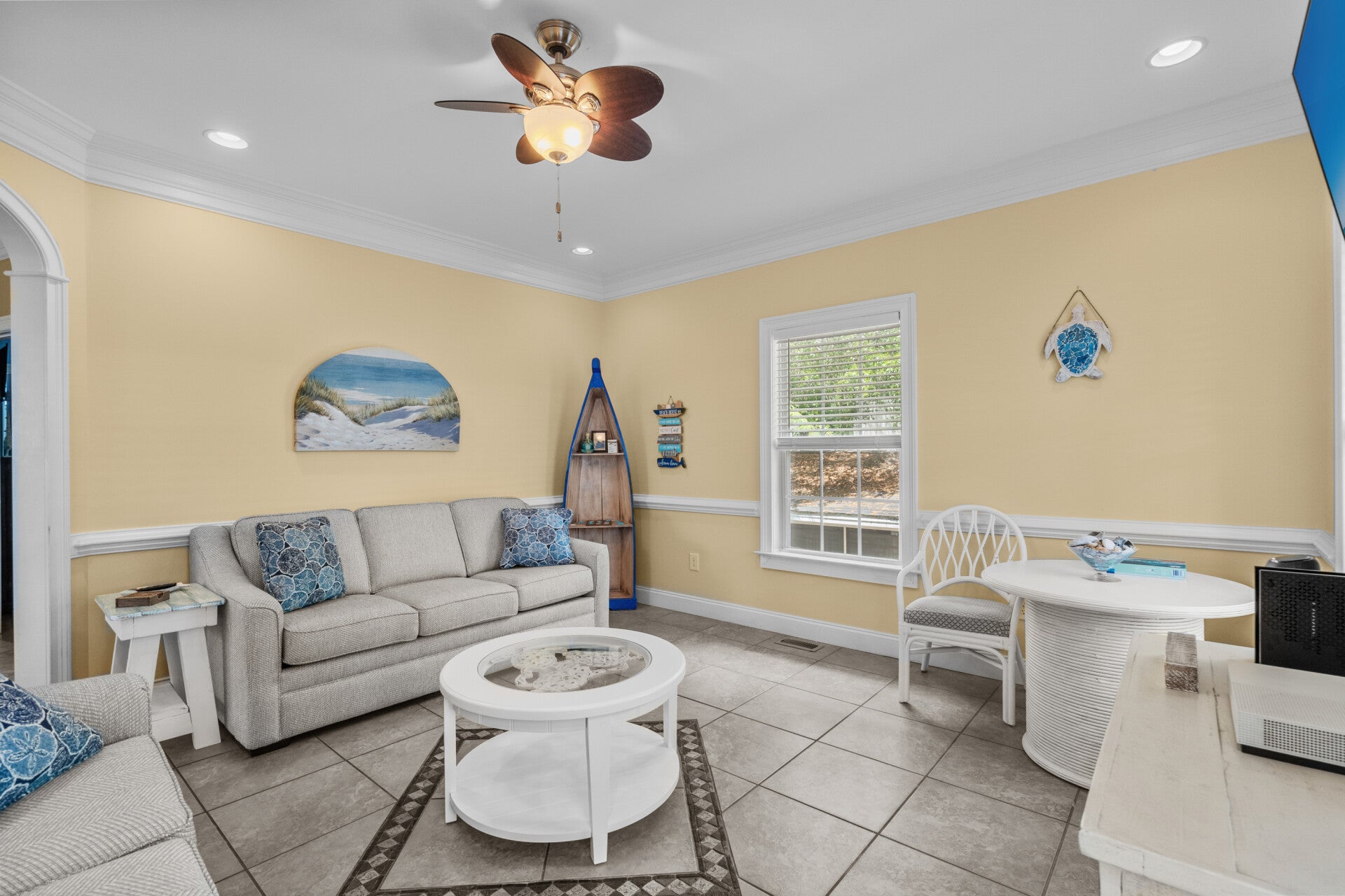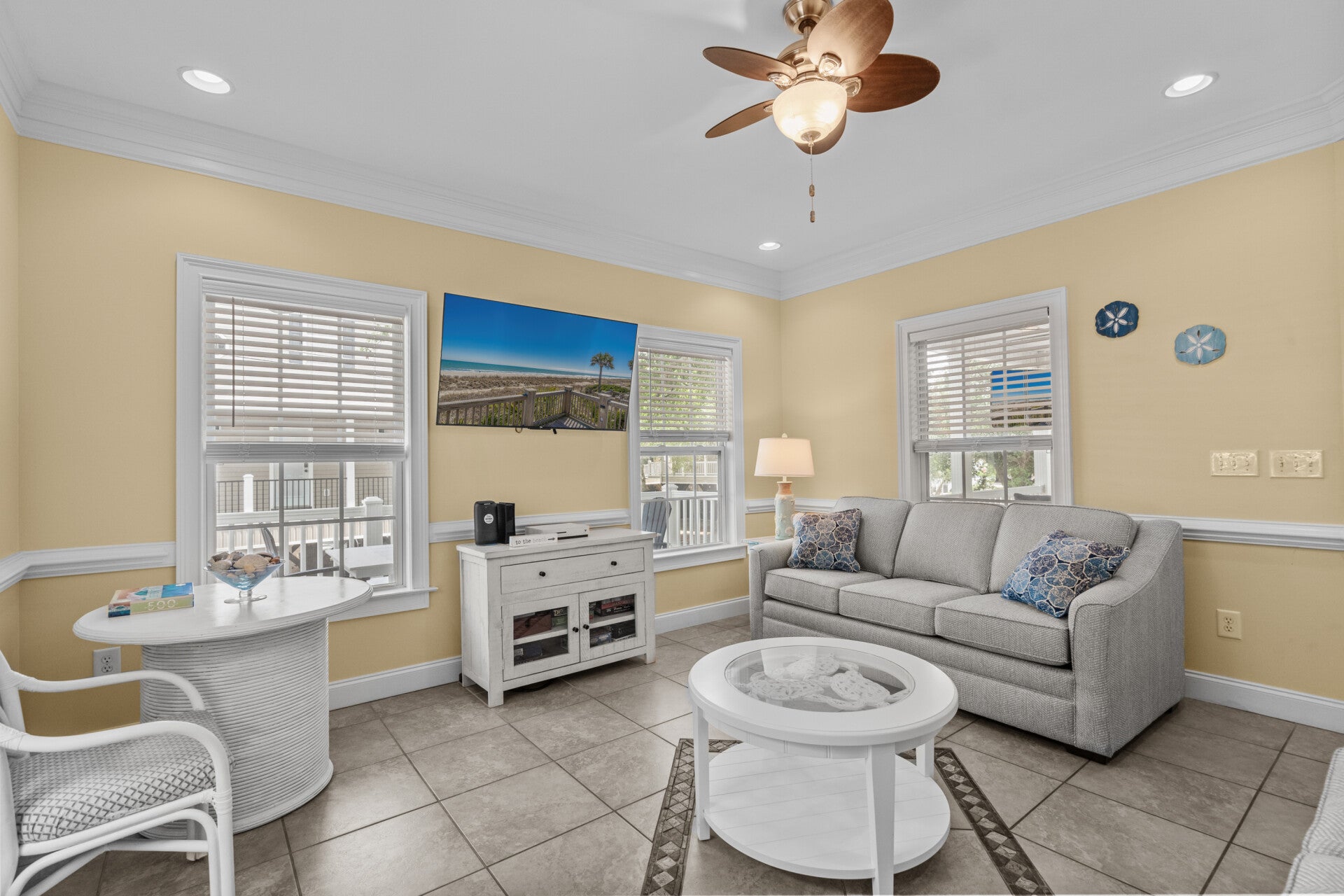 Kick back and unwind in the outdoor seating area at Ocean Oaks, where comfort meets coastal charm. Whether you're catching the big game, streaming a movie, or enjoying a breezy evening chat, the outdoor TV and cozy seating make this space a guest favorite. It’s the perfect spot to relax after a beach day—just grab a drink, sink into a chair, and let the ocean air do the rest.